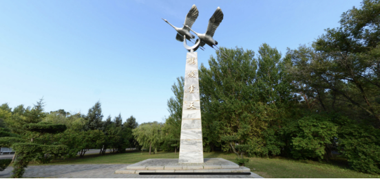 The sculpture, designed and constructed by the Central Academy of Fine Arts, stands at approximately 15 meters tall. At its top, there is stainless steel sculpture of two soaring red-crowned cranes, while beneath the cranes, four golden characters "He Li Yun Tian" were inscribed by Chen Lei, former Governor of Heilongjiang Province. The term "He Li" refers to the resonant cry of the red-crowned crane, and "Yun Tian" signifies that these birds can fly at altitudes of around 3000 meters, though they typically fly below 1000 meters.